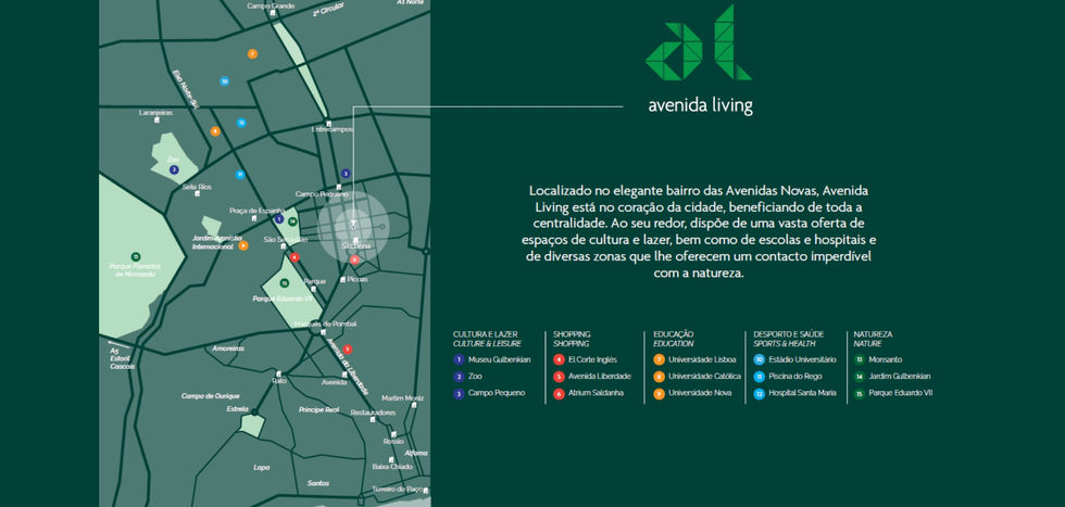 Localizado no elegante bairro das Avenidas Novas, nasce o Avenida Living em pleno coração da cidade, beneficiando de toda a centralidade. Ao seu redor, dispõe de uma vasta oferta de espaços de cultura e lazer, bem como de escolas e hospitais e de diversas zonas que lhe oferecem um contacto imperdível